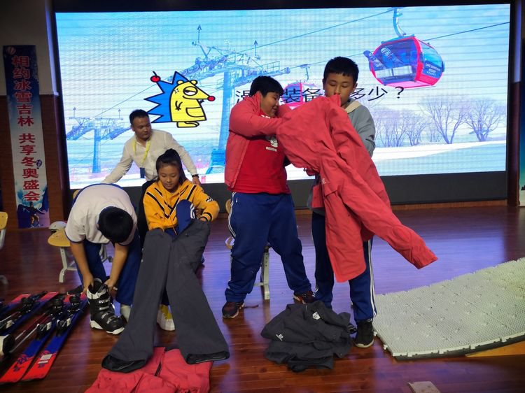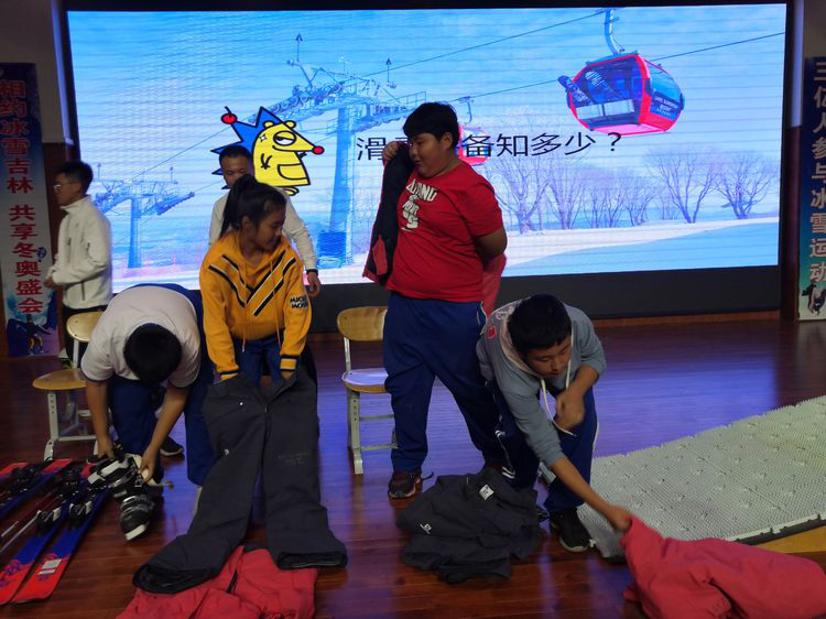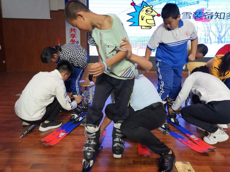 躍躍欲試的同學(xué)們?cè)诒┲v師的指導(dǎo)下親身體驗(yàn)滑雪裝備的魅力,興奮不已。